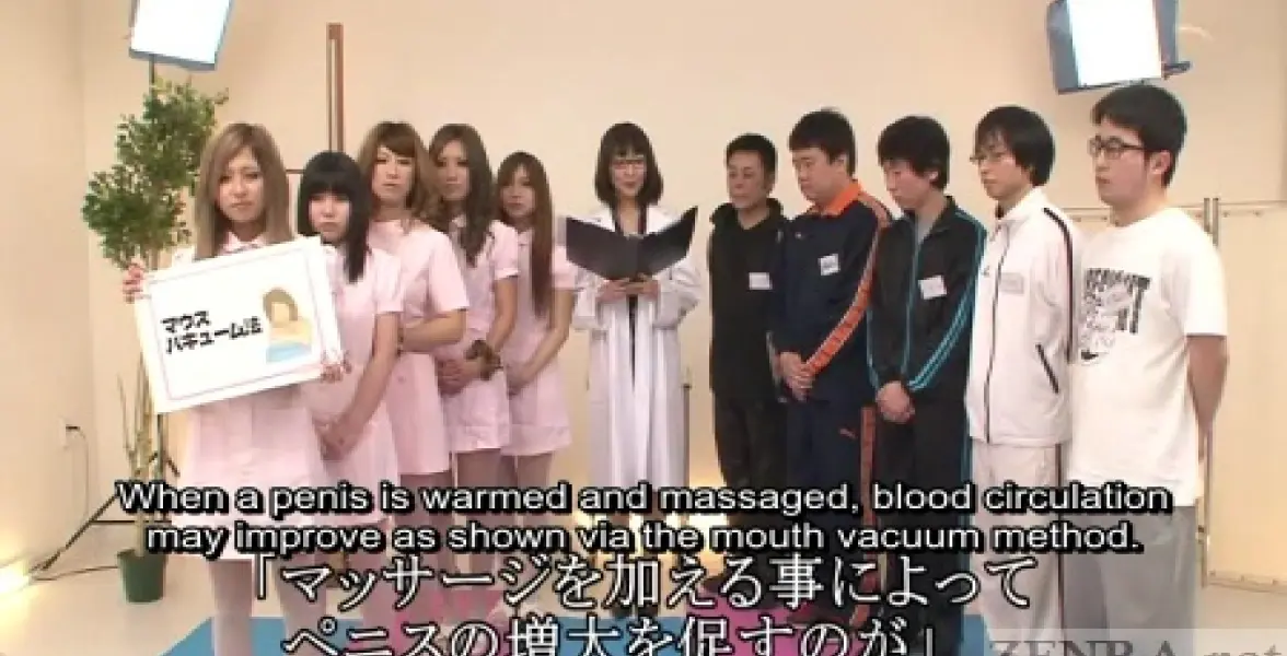 Today, we're once again joined by the vivacious Myu-san--Myu-sensei for today as she dons the white robe of a doctor, but with a very low cut top--who long time fans of Zenra may recall as the host with the caterwauling voice of a gamut of CFNM movies along with the ENF and CMNF embarrassment-fest that is Stark Naked Emergency Safety Drills. Myu-sensei, with the aid of five gyaru nurses, takes on five men with inadequately small penises for a crash course in penis enlargement. The techniques--which she picked up while studying abroad in America (or so she says...)--are as natural as they come and as we'll soon see, very 'hands-on' with a focus on pair-work rather than solo-play.