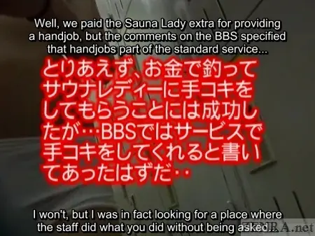 Her tip turned out to be fruitful. Although the first location did feature Japanese woman wearing little bathing and massaging men, sexual services were essentially non-existent. Their trek to this new location found actual Sauna Ladies akin to the ones they created for their productions. Uniforms were near see-through and handjobs to ejaculation were standard! Of course, stopping at a handjob was not enough and the latter portion of this production focuses heavily on escalation. Just how far could on go without having to open one's wallet...?