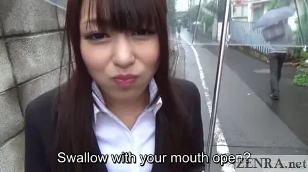 Another choice scene was an outdoor POV fantasy helmed by RUSHER MIYOSHI himself. AYU SAKURAI played a college senior interviewing for a job at a strange door-to-door sales company. Apparently her position involved meeting customers at home and providing them with blowjobs. The gokkun portion, however, was not performed in their homes. Rather, RUSHER had her walk back outside with a full mouth and perform everyone's favorite sticky-throat swallowing right out in ! Granted, it was an overcast day with on-and-off rain, but gokkun in is certainly ambitious.