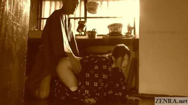 A SHOWA TALE OF AN AMOROUS CAREGIVER--as the name implies--takes place in the Showa Era, the time period that began in the 1920's and concluded with a the apex of Japan's bubble economy in 1989. With a time span crossing decades, filming a 'Showa era' title can mean many things: it can be an 80's tale of Japan's ascent to economic supremacy, a story about the reconstruction that took place in the 60's and 70's (or the youth revolt in the 60's), or in the case of today's update, a title about abnormal sex and infidelity that happens shortly after the conclusion of WW2.