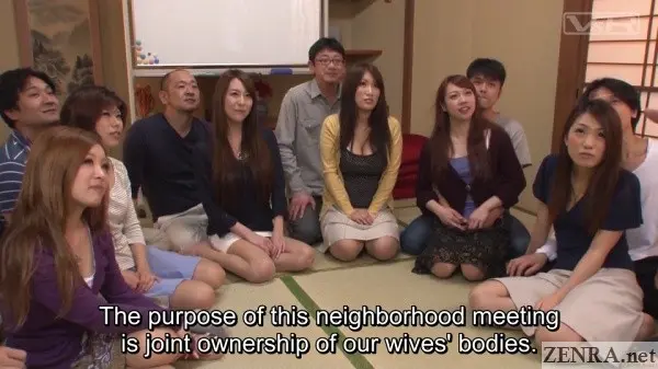 Don't let the preview for TWICE MONTHLY MANDATORY NEIGHBORHOOD ORGY deceive you! This is not a 150 minute nonstop orgy. And no, that is not an attack or even a nitpick. Nonstop orgies are great, but if V&R, a JAV maker known for insane amounts of creativity took *that* route, I'd be disappointed. I want humor, weird reasons for having sex, and seeing confused housewives engaging in the most prurient acts imaginable while their husbands watch on with approbation. THAT's what we get in this release--a truly amazing one I may add.