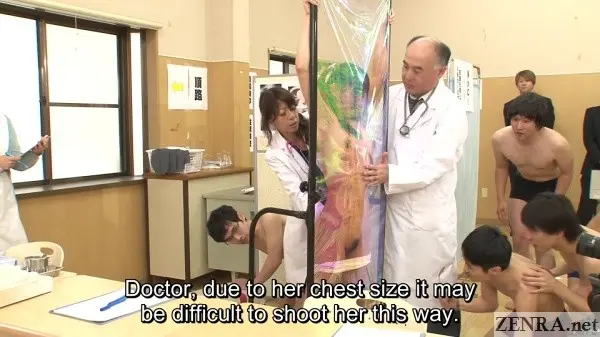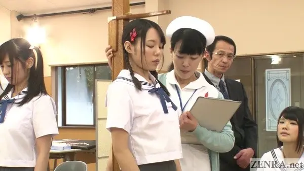 NEW STUDENT PHYSICAL EXAMINATION DAY 2, like the first one, is a good JAV movie. It's almost but not quite a great JAV movie. On one hand, you've a huge cast of five actresses, two or three female nurses and doctors (played by older women who often take on clothed roles in JAV movies), a trio of doctors played by actors we've all seen many a time, and a huge cast of other extras as well. SADISTIC VILLAGE may not be the most popular studio when going by their minuscule internet presence both in Japan and abroad, but the quality of their titles is incredible. They're just too busy creating great movies to worry about all that fan outreach.