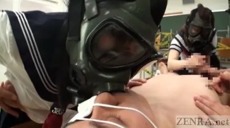 Gas Masks remain properly worn for nearly the entire production. In fact, aside from the short bonus feature at the end, you barely see the actual faces of the AV stars. A few times the masks may be lifted so fellatio can be performed and one raises it even higher to see her eyes, but aside from that, this is a 'masked' title. Since this title was released a few years ago, it can be considered the prototype of the popular 'mask' trend running its course now through the AV industry. When you can't see the face of an actress, you're apt to focus more on her body which worked very well for GAS MASK SCHOOLGIRLS.