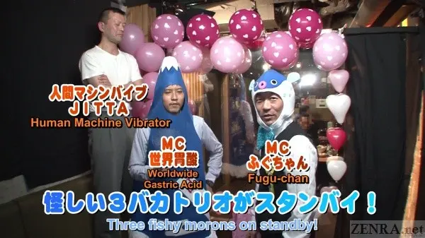 Delightful MC's in the form of the always engaging Abe-chan in a fish hat and one of SADISTIC VILLAGE's resident directors dressed as a volcano for some reason lead the way from start to sexy end. Later on, we even get "are you actually Japanese?" JAV actor Jitta Hanaoka to help out with his banana-clad manhood. (fun fact: Jitta may in fact be Korean if Wikipedia is indeed accurate).