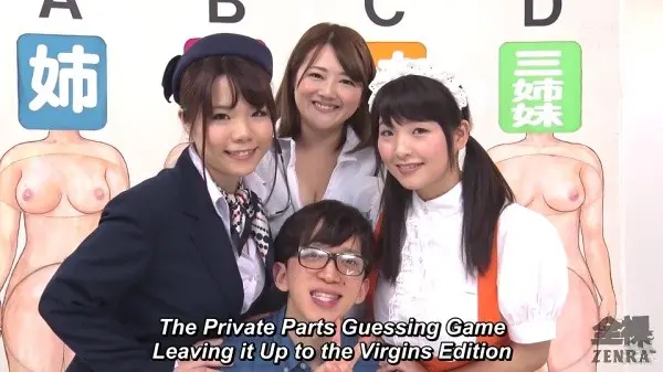 Getting right into it, even this author was on the fence about THE PRIVATE PARTS GUESSING GAME - LEAVING IT UP TO THE VIRGINS EDITION. That huge studio of yore? Gone. RIRI KOUDA? Absent. A huge cast? With only three contestants and one guy, not exactly. Extremely unusual challenges that this series has not yet done? Also negative. In fact, the trailer notes that this one has went back to its roots.